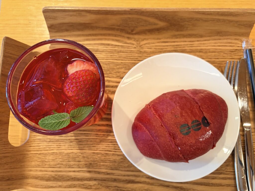 行けます。パンはセルフでピックアップするスタイルです。キオスクもありますが、カウンターでコラボドリンクの画像を見せればオーダーできます。