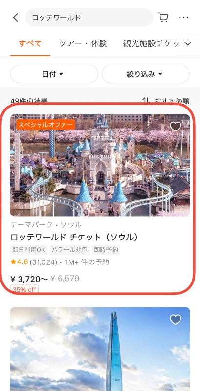 一番上に出てくる「ロッテワールドチケット(ソウル)」をクリック。