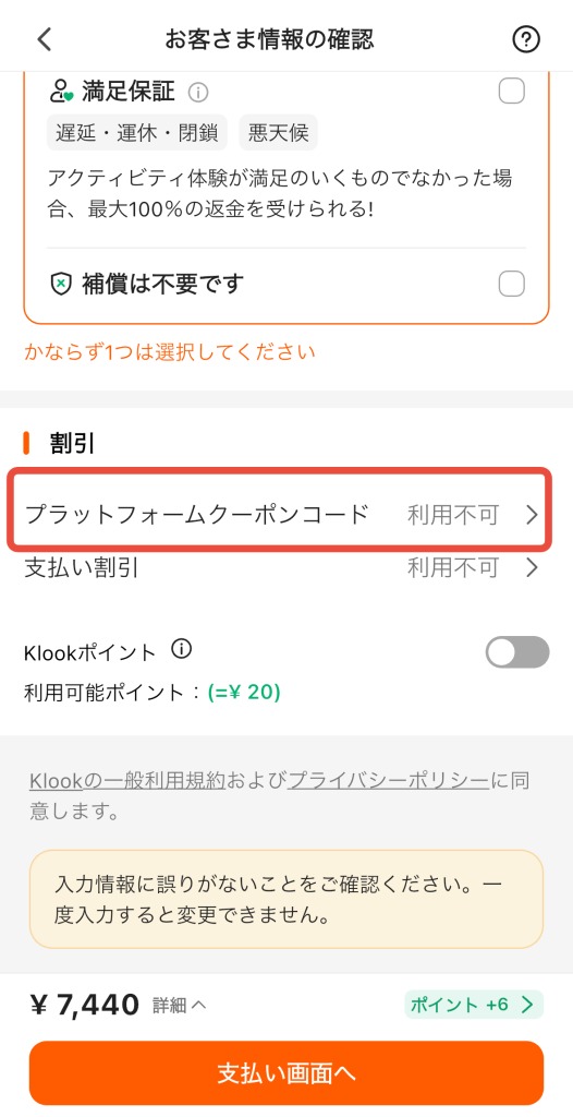 KLOOKなら、こちらの割引コードを入力すれば6%オフになりますよ。